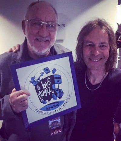 Pete Townshend tenant le logo du Bus Magique et Thierry Nydegger